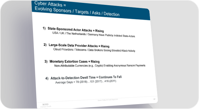 Cyber Attacks = Evolving Sponsors / Targets / Asks / Detection 1) State-Sponsored Actor Attacks = Rising USA / UK / The Netherlands / Germany Have Publicly Indicted State-Actors 2) Large-Scale Data Provider Attacks = Rising Cloud Providers / Telecoms / Data Brokers Seeing Elevated Attack Activity 3) Monetary Extortion Cases = Rising Non-Attributable Currencies (e.g., Crypto) Enabling Anonymous Ransom Payments 4) Attack-to-Detection Dwell Time = Continues To Fall Average Days = 78 (2018)…101 (2017)…416 (2011) Source: FireEye M-Trends Report 2019 Internet Trends 207 2019