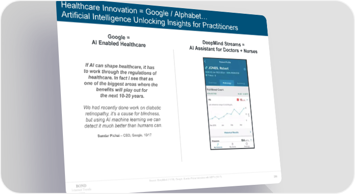 Healthcare Innovation = Google / Alphabet… Artificial Intelligence Unlocking Insights for Practitioners Google = DeepMind Streams = AI Enabled Healthcare AI Assistant for Doctors + Nurses If AI can shape healthcare, it has to work through the regulations of healthcare. In fact I see that as one of the biggest areas where the benefits will play out for the next 10-20 years. We had recently done work on diabetic retinopathy, it's a cause for blindness, but using AI machine learning we can detect it much better than humans can. Sundar Pichai – CEO, Google, 10/17 Source: DeepMind (11/18), Google. Sundar Pichai Interview with NDTV (10/17). Internet Trends 289 2019