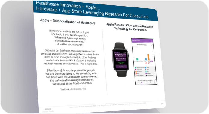 Healthcare Innovation = Apple… Hardware + App Store Leveraging Research For Consumers Apple = Democratization of Healthcare Apple ResearchKit = Medical Research Technology for Consumers If you zoom out into the future & you look back, & you ask the question, ‘What was Apple’s greatest contribution to mankind,’ it will be about health. Because our business has always been about enriching people’s lives. We’ve gotten into healthcare more & more through the Watch, other features created with ResearchKit & CareKit & including medical records on the iPhone. This a huge deal. [Healthcare] is very important for people. We are democratizing it. We are taking what has been with the institution & empowering the individual to manage their health. We’re just at the front end of this. Tim Cook – CEO, Apple, 1/19 Source: Apple. Tim Cook Interview with CNBC (1/19). Morgan Stanley estimates that 70MM Apple Watch units have been sold from 4/15-3/19. Internet Trends 288 2019