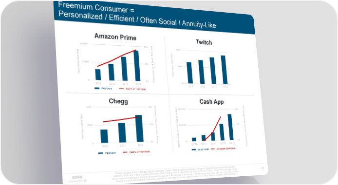 Freemium Consumer = Personalized / Efficient / Often Social / Annuity-Like Amazon Prime Twitch ) 140MM 40% e 4MM 40% in L ) ) Red Bar Bar ( e l e a t Blu o Blu ( T ( s 70MM 20% f s r o r 2MM 20% % Use Use r id id a Use a P P g in y 0 0% a P 0 0% 2015 2016 2017 2018 2015 2016 2017 2018 Paid Users Paid % of Total Users Chegg ) Cash App ) 4MM 30% e ) e in $400MM $4B in L L Bar ) Red e Red ( Bar ( Blu l ( d e a n t p e o p p Blu T A ( S 2MM 15% f h s o $200MM $2B d r % Cas Car Use r in h id a Use s d Cas P g n in u d y F a ze 0 0% P d $0 $0 li e a 2016 2017 2018 r u o Q4:16 Q2:17 Q4:17 Q2:18 Q4:18 n t n S A Paid Users Paid % of Total Users Stored Funds Annualized Card Spend Source: Amazon Prime = Morgan Stanley estimates. Twitch = Morgan Stanley estimates. Chegg = Goldman Sachs Investment Research estimates. Cash App = Square public disclosures. Note: Paying users = subscribers for Amazon Prime / Twitch / Chegg. For Cash App, stored Internet Trends funds represent aggregate customer balances in the app as of the last day of the quarter. For all except Cash App, paid user % of total = share 112 2019 of payers in a period divided by total active users in the same period. Active users for Amazon = Active Paid accounts per MS estimates.