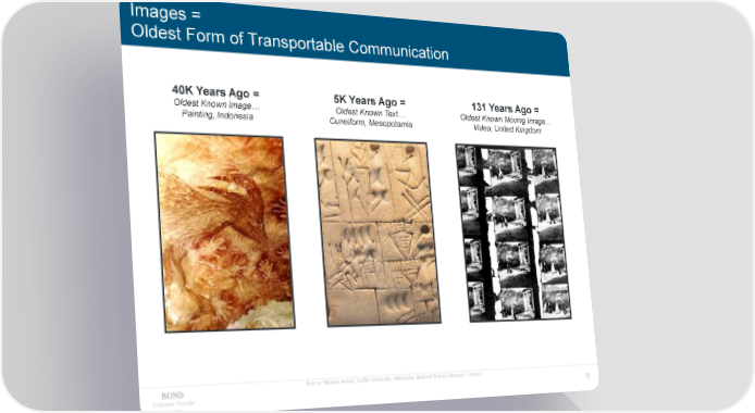 Images = Oldest Form of Transportable Communication 40K Years Ago = 5K Years Ago = 131 Years Ago = Oldest Known Image… Oldest Known Text… Oldest Known Moving Image… Painting, Indonesia Cuneiform, Mesopotamia Video, United Kingdom Source: Maxime Aubert, Griffith University, Wikimedia, National Science Museum, London. Internet Trends 72 2019