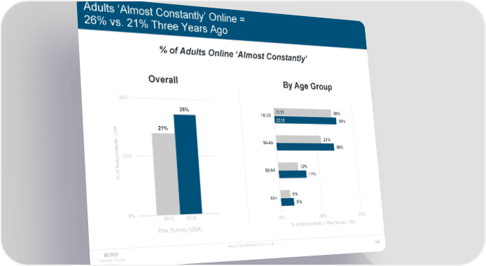 Adults ‘Almost Constantly’ Online = 26% vs. 21% Three Years Ago % of Adults Online ‘Almost Constantly’ Overall By Age Group 30% 26% 18-29 2015 36% 2018 39% A 21% US , 28% ts 30-49 en 36% nd15% po Res 12% 50-64 % of 17% 65+ 6% 8% 0% 2015 2018 All Adults 0% 25% 50% Pew Survey (USA) % of Respondents in Pew Survey, USA Source: Pew Research (7/15 + 1/18) Internet Trends 160 2019