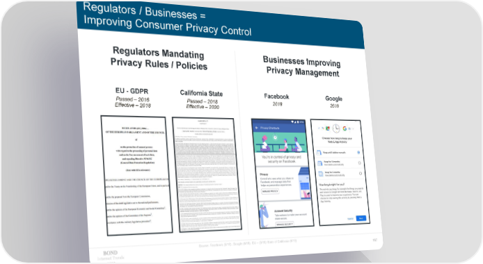 Regulators / Businesses = Improving Consumer Privacy Control Regulators Mandating Businesses Improving Privacy Rules / Policies Privacy Management EU - GDPR California State Facebook Google Passed – 2016 Passed – 2018 2018 2019 Effective – 2018 Effective – 2020 Source: Facebook (5/18). Google (4/18). EU – (3/18) State of California (6/18) Internet Trends 167 2019