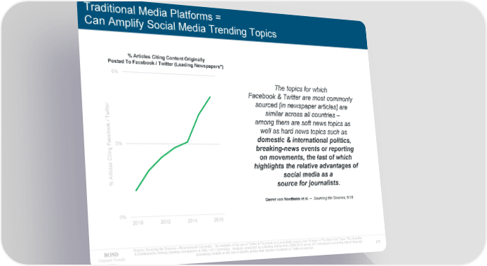 Traditional Media Platforms = Can Amplify Social Media Trending Topics % Articles Citing Content Originally Posted To Facebook / Twitter (Leading Newspapers*) 6% The topics for which Facebook & Twitter are most commonly er sourced [in newspaper articles] are t t i similar across all countries – Tw / among them are soft news topics as k well as hard news topics such as ceboo domestic & international politics, Fa 3% breaking-news events or reporting ng i t i on movements, the last of which C es highlights the relative advantages of cl i t r social media as a A % source for journalists. Gerret von Nordheim et al. – Sourcing the Sources, 6/18 0% 2010 2012 2014 2016 Source: Sourcing the Sources – Bournemouth University. *An analysis of the use of Twitter & Facebook as a journalistic source over 10 years in The New York Times, The Guardian, & Süddeutsche Zeitung (leading newspapers in USA / UK / Germany). Analysis conducted by collecting articles from 2006-2016 across all 3 newspapers & running natural language Internet Trends processing models on the text to identify articles that mention Facebook or Twitter as sources 177 2019