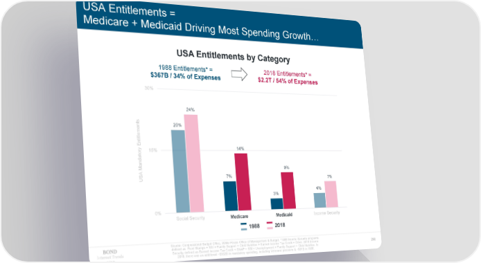 USA Entitlements = Medicare + Medicaid Driving Most Spending Growth… USA Entitlements by Category 1988 Entitlements* = 2018 Entitlements* = $367B / 34% of Expenses $2.2T / 54% of Expenses 30% 24% ts 20% en em tl nti E y 14% r 15% ato nd Ma 9% A 7% US 7% 3% 4% 0% Social Security Medicare Medicaid Income Security Medicare Medicaid 1988 2018 1988 2018 1988 2018 Source: Congressional Budget Office, White House Office of Management & Budget. *1988 Income Security programs defined as Food Stamps + SSI + Family Support + Child Nutrition + Earned Income Tax Credit + Other. 2018 Income Internet Trends Security defined as Earned Income Tax Credit + SNAP + SSI + Unemployment + Family Support + Child Nutrition. In 266 2019 2018, there was an additional ~$302B in mandatory spending, including Veterans’ pensions & ~$81B in 1988.
