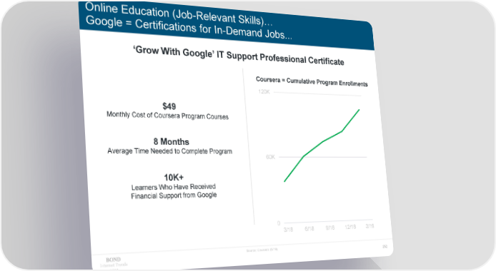 Online Education (Job-Relevant Skills)… Google = Certifications for In-Demand Jobs... ‘Grow With Google’ IT Support Professional Certificate Coursera = Cumulative Program Enrollments 120K $49 Monthly Cost of Coursera Program Courses 8 Months Average Time Needed to Complete Program 60K 10K+ Learners Who Have Received Financial Support from Google 0 3/18 6/18 9/18 12/18 3/19 Source: Coursera (6/19). Internet Trends 252 2019
