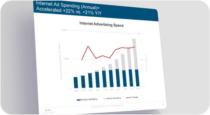 Internet Ad Spending (Annual)= Accelerated +22% vs. +21% Y/Y Internet Advertising Spend $120B 30% ) ars B ( A ) US ne , Li nd $60B 15% pe Red S ( th ng i s ow r erti G dv A /Y Y ernet Int 0 0% 2009 2010 2011 2012 2013 2014 2015 2016 2017 2018 Desktop Advertising Mobile Advertising Y/Y Growth Source: IAB / PWC Internet 2018 Advertising Report (5/19). Internet Trends 23 2019