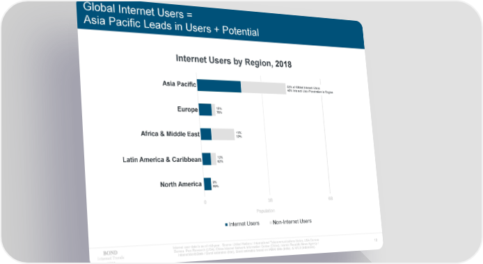 Global Internet Users = Asia Pacific Leads in Users + Potential Internet Users by Region, 2018 Asia Pacific 53% of Global Internet Users Asia Pacific 48% 48% Internet User Penetration in Region 15% Europe 78% Europe 78% (15%) 13% Africa & Middle East 32% Africa & Middle East 32% South America & 10% Latin America & Caribbean 62% Carribean 62% 9% North America 89% North America 89% 0 3B 6B Population Internet Users Non-Internet Users Internet user data is as of mid-year. Source: United Nations / International Telecommunications Union, USA Census Bureau. Pew Research (USA), China Internet Network Information Center (China), Islamic Republic News Agency / Internet Trends InternetWorldStats / Bond estimates (Iran), Bond estimates based on IAMAI data (India), & APJII (Indonesia). 10 2019