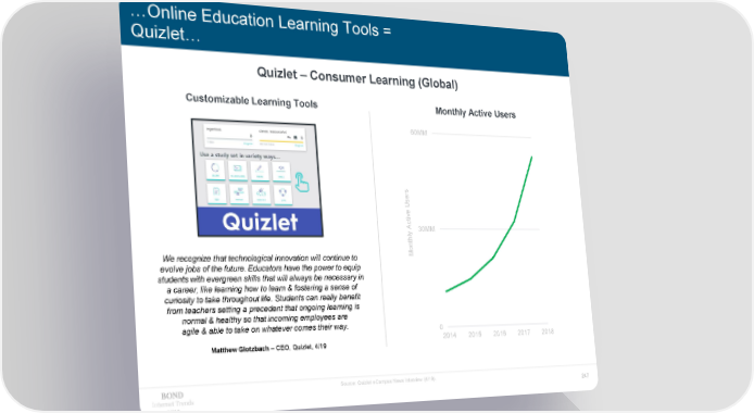 …Online Education Learning Tools = Quizlet… Quizlet – Consumer Learning (Global) Customizable Learning Tools Monthly Active Users 60MM s er s U e v ti Ac 30MM y We recognize that technological innovation will continue to Monthl evolve jobs of the future. Educators have the power to equip students with evergreen skills that will always be necessary in a career, like learning how to learn & fostering a sense of curiosity to take throughout life. Students can really benefit from teachers setting a precedent that ongoing learning is normal & healthy so that incoming employees are agile & able to take on whatever comes their way. 0 Matthew Glotzbach – CEO, Quizlet, 4/19 2014 2015 2016 2017 2018 Source: Quizlet eCampus News Interview (4/19). Internet Trends 247 2019
