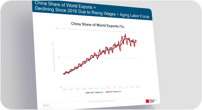 China Share of World Exports = Declining Since 2016 Due to Rising Wages + Aging Labor Force China Share of World Exports (%) 16% na %, Chi ts r po x E 8% d l r o W f e o r ha S 0% 2000 2001 2003 2004 2006 2007 2009 2010 2012 2013 2015 2016 2018 12M Trailing Sum 3M Trailing Sum Source: Haver Analytics, Morgan Stanley Research Internet Trends 301 2019