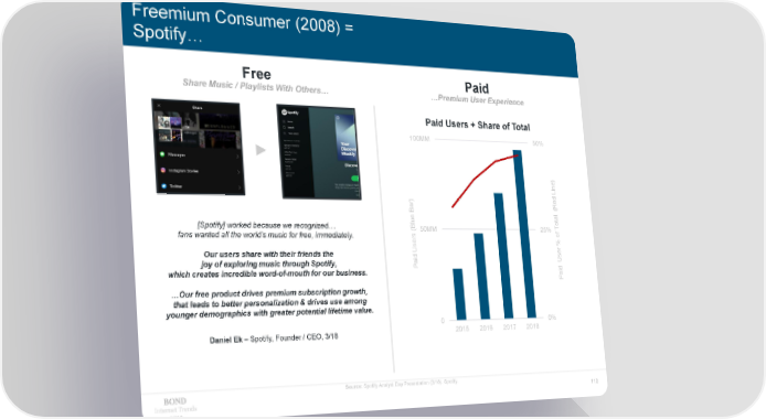 Freemium Consumer (2008) = Spotify… Free Paid Share Music / Playlists With Others… …Premium User Experience Paid Users + Share of Total 100MM 50% ) ne Li ar) Red B ( ue l l ota [Spotify] worked because we recognized… B T ( 50MM 25% fans wanted all the world's music for free, immediately. of ers Our users share with their friends the Us er % d Us joy of exploring music through Spotify, ai which creates incredible word-of-mouth for our business. P d ai P …Our free product drives premium subscription growth, that leads to better personalization & drives use among younger demographics with greater potential lifetime value. 0 0% Daniel Ek – Spotify, Founder / CEO, 3/18 2015 2016 2017 2018 Source: Spotify Analyst Day Presentation (3/18). Spotify. Internet Trends 110 2019