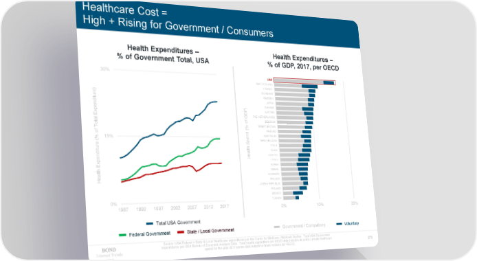 Healthcare Cost = High + Rising for Government / Consumers Health Expenditures – Health Expenditures – % of Government Total, USA % of GDP, 2017, per OECD 30% USUSAA SWITZERLAND FRANCE GERMANY ture) SWEDEN i JAPAN nd ) CANADA pe AUSTRIA x DP THE NETHERLANDS E G l BELGIUM ota % of GREAT BRITAIN T ( FINLAND % of15% nd AUSTRALIA pe NEW ZEALAND S ITALY ture ( th i SPAIN nd Heal GREECE pe CHILE x KOREA E th ISRAEL HUNGARY Heal IRELAND CZECH REPUBLIC POLAND MEXICO 0% TURKEY 1987 1992 1997 2002 2007 2012 2017 0% 10% 20% Total USA Government Federal Government State / Local Government Government / Compulsory Voluntary Source: USA Federal + State & Local Healthcare expenditures per the Center for Medicare / Medicaid Studies. Total USA Government expenditures per USA Bureau of Economic Analysis Data. Total Health expenditure per OECD data includes all public / private healthcare Internet Trends spend for the year 2017 (some data subject to future revision per OECD). 270 2019