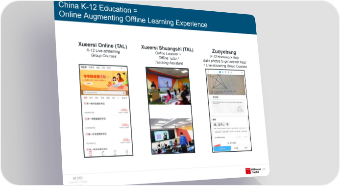 China K-12 Education = Online Augmenting Offline Learning Experience Xueersi Online (TAL) Xueersi Shuangshi (TAL) Zuoyebang K-12 Live-streaming Online Lecturer + K-12 Homework Help Group Courses Offline Tutor / (take photos to get answer help) Teaching Assistant + Live-streaming Group Courses Internet Trends 329 2019