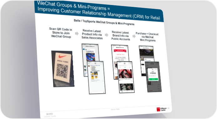 WeChat Groups & Mini-Programs = Improving Customer Relationship Management (CRM) for Retail Belle / TopSports WeChat Groups & Mini-Programs Scan QR Code in Receive Latest Receive Latest Purchase + Checkout Store to Join Product Info via Brand Info via via WeChat WeChat Group Sales Associates Public Accounts Mini Programs Source: Belle. Internet Trends 326 2019