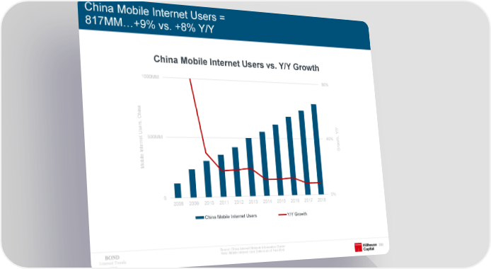 China Mobile Internet Users = 817MM…+9% vs. +8% Y/Y China Mobile Internet Users vs. Y/Y Growth 1000MM 80% na , Chi ers /Y Y Us 500MM 40% th, ow ernet r Int G e l bi Mo 0 0% 2008 2009 2010 2011 2012 2013 2014 2015 2016 2017 2018 China Mobile Internet Users Y/Y Growth Source: China Internet Network Information Center Note: Mobile Internet User Data is as of Year-End. Internet Trends 303 2019