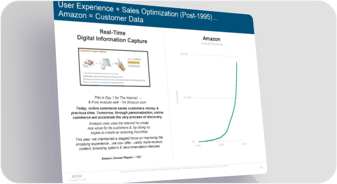 User Experience + Sales Optimization (Post-1995)… Amazon = Customer Data Real-Time Amazon Digital Information Capture Annual Revenue $250B ue This is Day 1 for The Internet – en $125B & if we execute well – for Amazon.com. Rev Today, online commerce saves customers money & precious time. Tomorrow, through personalization, online commerce will accelerate the very process of discovery. Amazon.com uses the Internet to create real value for its customers &, by doing so, hopes to create an enduring franchise. This year, we maintained a dogged focus on improving the shopping experience…we now offer...vastly more reviews, $0 content, browsing options & recommendation features. 1994 2006 2018 Amazon Annual Report – 1997 Source: Amazon Revenue from CapitalIQ (Collected 2019) Quote: 1997 Amazon Annual Report Image: Amazon.com (2019) Internet Trends 131 2019