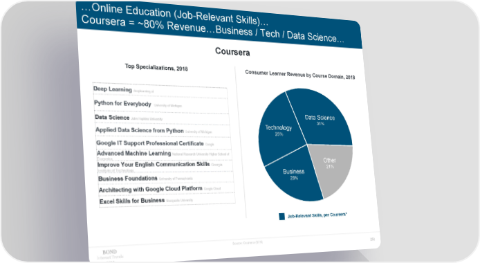 …Online Education (Job-Relevant Skills)… Coursera = ~80% Revenue…Business / Tech / Data Science… Coursera Top Specializations, 2018 Consumer Learner Revenue by Course Domain, 2018 Data Science Technology 31% 25% Other Business 21% 23% Job-Relevant Skills, per Coursera* Source: Coursera (6/19) Internet Trends 253 2019