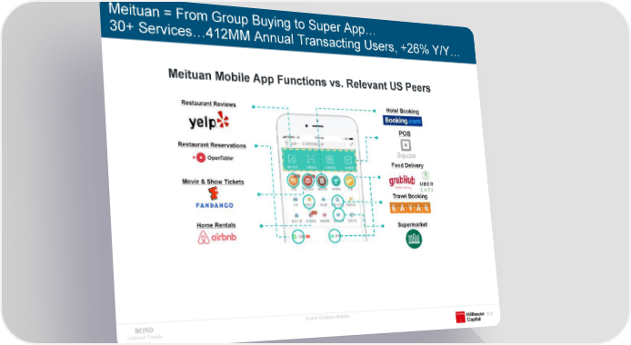 Meituan = From Group Buying to Super App… 30+ Services…412MM Annual Transacting Users, +26% Y/Y… MeituanMobile App Functions vs. Relevant US Peers Source: Company Material. Internet Trends 318 2019