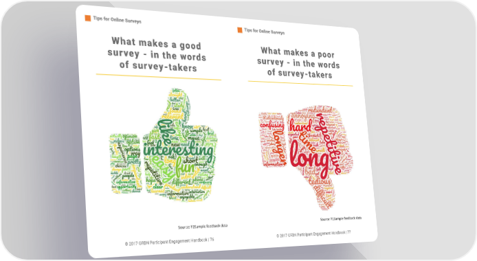 Tips for Online Surveys Tips for Online Surveys What makes a poor What makes a good survey - in the words survey - in the words of survey-takers of survey-takers Source: P2Sample feedback data Source: P2Sample feedback data © 2017 GRBN Participant Engagement Handbook | 76 © 2017 GRBN Participant Engagement Handbook | 77
