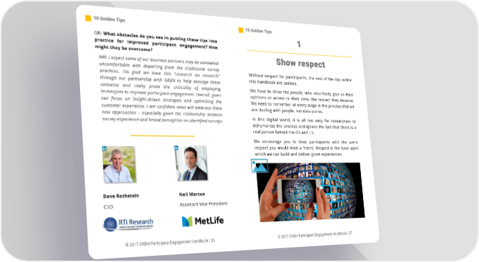 10 Golden Tips 10 Golden Tips DR: What obstacles do you see in putting these tips into 1 practice for improved participant engagement? How might they be overcome? Show respect NM: I expect some of our business partners may be somewhat uncomfortable with departing from the traditional survey Without respect for participants, the rest of the tips within practices. I’m glad we have this Ȋresearch on researchȋ this handbook are useless. through our partnership with GRBN to help assuage those concerns and really prove the criticality of employing We have to show the people, who voluntarily give us their techniques to improve participant engagement. Overall, given opinions or access to their data, the respect they deserve. our focus on insight-driven strategies and optimizing the We need to remember at every stage in the process that we customer experience, I am confident most will embrace these are dealing with people, not data points. new approaches – especially given the relationship between In this digital world, it is all too easy for researchers to survey experience and brand perception on identified surveys. dehumanize the process and ignore the fact that there is a real person behind the 0’s and 1’s. We encourage you to treat participants with the same respect you would treat a friend. Respect is the base upon which we can build and deliver great experiences. Dave Rothstein Neil Marcus CEO Assistant Vice President © 2017 GRBN Participant Engagement Handbook | 26 © 2017 GRBN Participant Engagement Handbook | 27