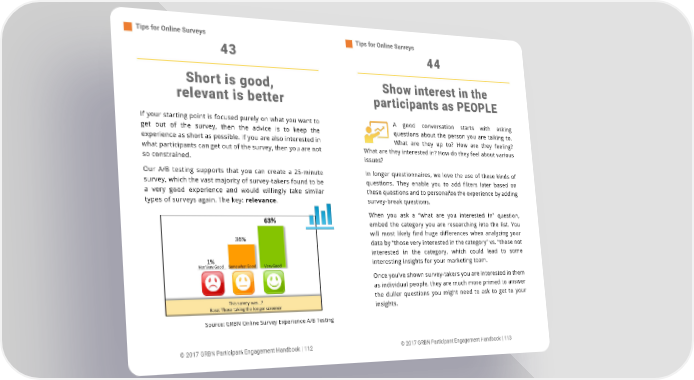 Tips for Online Surveys Tips for Online Surveys 43 44 Short is good, Show interest in the relevant is better participants as PEOPLE If your starting point is focused purely on what you want to A good conversation starts with asking get out of the survey, then the advice is to keep the questions about the person you are talking to. experience as short as possible. If you are also interested in What are they up to? How are they feeling? what participants can get out of the survey, then you are not What are they interested in? How do they feel about various so constrained. issues? Our A/B testing supports that you can create a 25-minute In longer questionnaires, we love the use of these kinds of survey, which the vast majority of survey-takers found to be questions. They enable you to add filters later based on a very good experience and would willingly take similar these questions and to personalize the experience by adding types of surveys again. The key: relevance. survey-break questions. When you ask a Ȋwhat are you interested inȋ question, embed the category you are researching into the list. You will most likely find huge differences when analyzing your data by Ȋthose very interested in the categoryȋ vs. Ȋthose not interested in the category, which could lead to some interesting insights for your marketing team. Once you’ve shown survey-takers you are interested in them as individual people, they are much more primed to answer the duller questions you might need to ask to get to your - insights. - Source: GRBN Online Survey Experience A/B Testing © 2017 GRBN Participant Engagement Handbook | 112 © 2017 GRBN Participant Engagement Handbook | 113