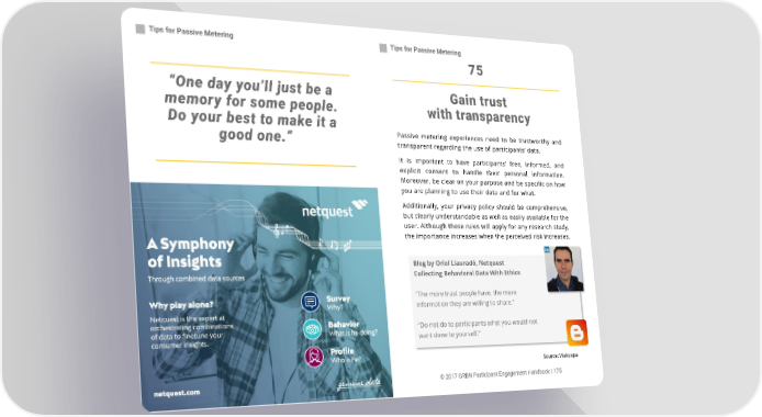 Tips for Passive Metering Tips for Passive Metering 75 ƈOne day you’ll just be a Gain trust memory for some people. with transparency Do your best to make it a good one.Ɖ Passive metering experiences need to be trustworthy and transparent regarding the use of participants’ data. It is important to have participants’ free, informed, and explicit consent to handle their personal information. Moreover, be clear on your purpose and be specific on how you are planning to use their data and for what. Additionally, your privacy policy should be comprehensive, but clearly understandable as well as easily available for the user. Although these rules will apply for any research study, the importance increases when the perceived risk increases. Blog by Oriol Llauradó, Netquest Collecting Behavioral Data With Ethics ȊThe more trust people have, the more information they are willing to share.ȋ ȊDo not do to participants what you would not want done to yourself.ȋ Source: Wakoopa © 2017 GRBN Participant Engagement Handbook | 174 © 2017 GRBN Participant Engagement Handbook | 175