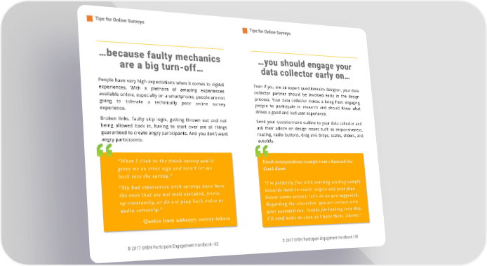 Tips for Online Surveys Tips for Online Surveys 7 …because faulty mechanics …you should engage your are a big turn-off… data collector early on… People have very high expectations when it comes to digital Even if you are an expert questionnaire designer, your data experiences. With a plethora of amazing experiences collector partner should be involved early in the design available online, especially on a smartphone, people are not process. Your data collector makes a living from engaging going to tolerate a technically poor online survey people to participate in research and should know what experience. drives a good and bad user experience. Broken links, faulty skip logic, getting thrown out and not Send your questionnaire outline to your data collector and being allowed back in, having to start over are all things ask their advice on design issues such as responsiveness, guaranteed to create angry participants. And you don’t want routing, radio buttons, drag and drops, scales, sliders, and angry participants. autofills. ȃWhen I click to the finish survey and it Email correspondence example from a Research For gives me an error sign and won't let me Good client: back into the survey.Ȅ ȃMy bad experiences with surveys have been ȃIȂm perfectly fine with starting sending sample the ones that are not well executed, freeze towards hard-to-reach targets and your plan up constantly, or do not play back video or below seems perfect; letȂs do as you suggested. audio correctly.Ȅ Regarding the education, you are correct with your assumptions, thanks for looking into this. - Quotes from unhappy survey-takers IȂll send news as soon as I have them. Cheers!" © 2017 GRBN Participant Engagement Handbook | 82 © 2017 GRBN Participant Engagement Handbook | 83