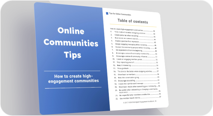 Tips for Online Communities Tips for Online Communities Table of contents How to create high-engagement communities ........................ 40 1. Think mobile first when designing activities ................... 42 Online 2. Create personas when recruiting .................................... 43 3. Brainstorm recruitment sources ...................................... 44 4. Create a positive first impression .................................... 45 Communities 5. Design engaging messaging when recruiting .................. 46 6. Explain the community purpose when recruiting ........... 48 7. Set expectations from the beginning............................... 49 8. Encourage a sense of community membership .............. 50 Tips 9. Encourage a sense of community influence .................... 51 10. Create an engaging member portal ................................. 52 11. Stop repeating yourself .................................................... 53 12. Keep it interesting ............................................................ 54 13. Show gratitude ................................................................. 56 14. The shorter the better when designing activities ........... 57 15. Share back to members ................................................... 58 How to create high- 16. Keep the conversation going ........................................... 60 engagement communities 17. Encourage storytelling ..................................................... 61 18. Create the right farewell message ................................... 62 19. Share back results when sunsetting your community .... 64 20. Be careful when rebranding or changing a community experience ........................................................................ 65 21. Be respectful when members unsubscribe ..................... 66 22. Use member health metrics ............................................. 67 © 2017 GRBN Participant Engagement Handbook | 39 © 2017 GRBN Participant Engagement Handbook | 1