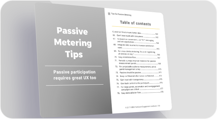 Tips for Passive Metering Tips for Passive Metering Table of contents Customers’ trust means better data ............................... 160 Passive 66. Don’t lose touch with consumers ........................... 162 67. To maximize conversions, use ȊVIPȋ messaging and set expectations ............................................... 164 Metering 68. Integrate data sources to increase satisfaction rates ......................................................................... 165 69. For cross-device metering, focus on registering all devices on day 1 ................................................. 166 Tips 70. Easy installation flow ............................................... 167 71. Periodic surveys improve retention for passive measurement panels ............................................... 168 72. For projectable audience measurement, active panel management is key ....................................... 170 Passive participation 73. Passive should be passive ....................................... 171 requires great UX too 74. Keep confidential information confidential ........... 172 75. Gain trust with transparency .................................. 175 76. Give back control to the participant ....................... 176 77. For large panels, automation and re-engagement campaigns are critical ............................................. 177 78. Easy deinstallation flow .......................................... 178 © 2017 GRBN Participant Engagement Handbook | 159 © 2017 GRBN Participant Engagement Handbook | 159