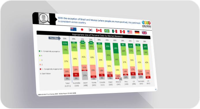 With the exception of Brazil and Mexico (where people are more positive), this sentiment is consistent across country. Appropriate Use of Personal Data by Market Research Top 2 Box 33% 25% 19% 20% 28% 49% 63% 35% 29% 33% 33% 11% 5% 2% 2% 6% 8% 12% 7% 18% 18% 20% 16% 20% 22% 29% 26% 23% 26% 17% 16% 5 – Completely appropriate 4 41% 40% 29% 3 39% 39% 34% 36% 37% 37% 42% 42% 2 30% 1 – Completely inappropriate 18% 14% 17% 16% 2% 29% 18% 24% 14% 11% Don’t Know 9% 8% 9% 5% 19% 6% 24% 5% 7% 7% 10% 4% 9% 9% 5% 9% 7% 3% 1% 10% 10% 10% 6% Total Australia Japan Korea Canada Brazil Mexico Peru US Germany UK (4,971) (500) (498) (501) (521) (503) (505) (500) (496) (495) (452) GRBN Global Trust Survey 2020 - Global Report © 2020 GRBN 62
