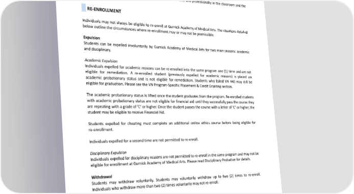 ● Calculate and select proper technical factors according to the individual needs of the patient and the requirementsoftheprocedure’sstandardsofspeedandaccuracy. ● Review and evaluate the recorded images on a computer monitor and archiving system for identifying patient pathology, if present, accurate positioning and technical factors for completion of adiagnostic examination, and other appropriate and pertinent technical qualities. ● Copewithheavyworkloads,demandingpatients,andlife-threateningclinicalsituations. ● Behave ethically, soundly, competently compassionate, and professionally in the classroom and the clinic. RE-ENROLLMENT Individuals may not always be eligible to re-enroll at Gurnick Academy of Medical Arts. The situations detailed belowoutlinethecircumstanceswherere-enrollmentmayormaynotbepermissible. Expulsion Students can be expelled involuntarily by Gurnick Academy of Medical Arts for two main reasons: academic anddisciplinary. AcademicExpulsion Individuals expelled for academic reasons can be re-enrolled into the same program one (1) time and are not eligible for remediation. A re-enrolled student (previously expelled for academic reasons) is placed on academic probationary status and is not eligible for remediation. Students who failed VN 440 may still be eligible for graduation. Please see the VN Program-Specific Placement & Credit Granting section. The academic probationary status is lifted once the student graduates from the program. Re-enrolled students with academic probationary status are not eligible for financial aid until they successfully pass the course they are repeating with a grade of ’C’ or higher. Once the student passes the course with a letter of ’C’ or higher, the student maybeeligible to receive Financial Aid. Students expelled for cheating must complete an additional online ethics course before being eligible for re-enrollment. Individuals expelled for a second time are not permitted to re-enroll. Disciplinary Expulsion Individuals expelled for disciplinary reasons are not permitted to re-enroll in the same program and may not be eligible for enrollment at Gurnick Academy of Medical Arts. Please read Disciplinary Probation for details. Withdrawal Students may withdraw voluntarily. Students may voluntarily withdraw up to two (2) times to re-enroll. Individuals who withdraw more than two (2) times voluntarily may not re-enroll. FOREIGNTRANSCRIPT/DIPLOMAEVALUATIONS All foreign transcripts and degrees must be evaluated and translated into equivalent college hours by a “Foreign education transcript evaluation organization” to be accepted by Gurnick Academy of Medical Arts. Some affiliated institutions of your program, such as certification and licensure bodies, may require a specific provider to evaluate your foreign degree/diploma. The student must check with the program’s 72