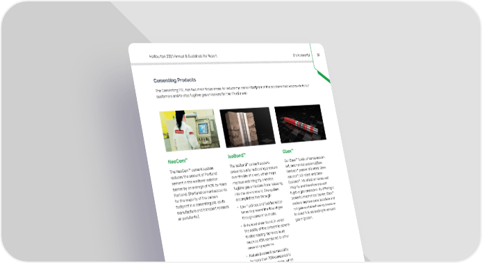 Halliburton 2021 Annual & Sustainability Report Environmental 39 Cementing Products The Cementing PSL has two main focus areas: to reduce the carbon footprint of the solutions that we provide to our customers and to stop fugitive gas emissions for the life of a well. NeoCem™ IsoBond™ Obex™ The NeoCem™ cement system The IsoBond™ cement system Our Obex™ family of compression- reduces the amount of Portland prevents sustained casing pressure set, mechanical packers (Obex cement in the wellbore isolation over the life of a well, which helps GasLock™ packer, V0 rated; Obex barrier by an average of 40% by mass improve well integrity and stop IsoLock™, V3 rated; and Obex Portland. (Portland cement accounts fugitive gas emissions from releasing EcoLock™, V6 rated) enhance well for the majority of the carbon into the environment. The system integrity and therefore prevent footprint in a cementing job, as its accomplishes this through: fugitive gas emissions. By offering a manufacture and transport releases • Low fluid loss and fast transition powerful mechanical barrier, Obex™ air pollutants.) times to prevent the flow of gas packers improve zonal isolation and through cement as it sets. mitigate sustained casing pressure to avoid failures leading to annular • Enhanced shear bond, in which gas migration. the ability of the cement to adhere to steel casing improves by as much as 40% compared to other cementing systems. • Reduced cement permeability by more than 70% compared to other cementing systems, which prevents gas and other wellbore fluids from migrating through the cement after it sets.