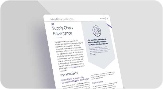 Halliburton 2021 Annual & Sustainability Report Governance 23 G5 Supply Chain Governance Our supply chain mission is to work with Our Supplier Conduct and suppliers who share our commitment to integrity Responsible Procurement and ethical business practices. We use set Sustainability Commitment structures to screen suppliers, measure their compliance within our supply chain, and ensure Cultivate a sustainable supply chain through the continuous improvement of internal processes, by they align with our mission. To learn about our performing proactive risk assessments and by working Supplier Management System, along with our collaboratively with our diverse mix of global and policies for local supplier procurement, conflict local suppliers. minerals, prevention of modern slavery and human trafficking, and our expectations for suppliers related to compliance and training, please visit the Supplier Relations section of our website. 2021 HIGHLIGHTS Human Rights as an Essential assess inherent risk in our supply chain based on country, Component of Supplier Qualification category, and spend classification, which helps prioritize areas for detailed follow-up. Halliburton recognizes the importance of performing due diligence on suppliers with respect to slavery and human Internal Training trafficking. We require suppliers to contractually commit to protect and uphold the fundamental human rights of Halliburton uses trainings from many professional training their employees as stated in the United Nations Universal bodies focused on supply chain and procurement, Declaration of Human Rights. We also comply with the including the Chartered Institute of Procurement and UK Modern Slavery Act of 2015 and the Australia Modern Supply (CIPS), the world’s largest professional body Slavery Act of 2018. (To learn more about our compliance serving procurement and supply organizations with more with Australia’s Modern Slavery Act, please visit Chapter than 200,000 procurement and supply chain professionals S6 on Human Rights in this report.) in more than 150 countries. CIPS conducts training on such issues as ethics, compliance, conflict minerals, and human In 2021, Halliburton implemented our new digital rights awareness. supplier management system, which includes the Supplier Lifecycle Performance (SLP) and Supplier Another training Halliburton takes part in is a new course Performance Management (SPM) modules. SLP covers for suppliers and contractors that focuses on labor all elements of supplier request, onboarding, and rights and identification of worker exploitation. The qualification. SPM provides a robust tool to monitor training, developed in collaboration with the International and manage supplier performance. Petroleum Industry Environmental Conservation Association (IPIECA), includes 12 interactive modules We also developed and built new comprehensive human covering topics such as fair recruitment, discrimination, rights assessments into supplier qualification in SLP working hours, worker accommodation, worker grievance and performance assessments in SPM. Additionally, mechanisms, and forced labor. Halliburton uses an internal human rights dashboard to