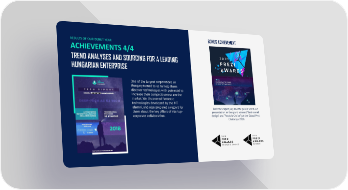 BONUS ACHIEVEMENT RESULTS OF OUR DEBUT YEAR ACHIEVEMENTS 4/4 TREND ANALYSES AND SOURCING FOR A LEADING HUNGARIAN ENTERPRISE One of the largest corporations in Hungary turned to us to help them discover technologies with potential to increase their competitiveness on the market. We discovered fantastic technologies developed by the HT alumni, and also prepared a report for Both the expert jury and the public voted our them about the key pillars of startup- corporate collaboration. presentation as the grand winner (“Best overall design” and “People’s Choice”) at the Global Prezi Challenge 2018.