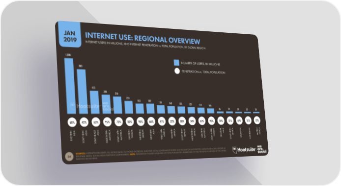 JAN INTERNET USE: REGIONAL OVERVIEW 2019 INTERNET USERS IN MILLIONS, AND INTERNET PENETRATION vs. TOTAL POPULATION, BY GLOBAL REGION 1,000 NUMBER OF USERS, IN MILLIONS 803 PENETRATION vs. TOTAL POPULATION 415 346 316 233 183 182 158 140 135 121 114 100 36 34 29 23 20 60% 42% 63% 95% 73% 80% 94% 66% 41% 32% 88% 50% 63% 95% 50% 51% 69% 51% 12% N A N A T A N A N A N E N E N A N A N A N E N A L A N E L A N A A N E A R I R I S I R C R C R P R P R I R C R C R P R C A C R P A I R C I A L C E S E S A S E I E I E O E O E S E I E I E O E I R I E O R S E I N E D I T A H A E A R H R T R T R T A T R T R H R R T R R T A H R A D R S H H E E S S S S F S F H F N E H N F E I F T T T U U A A T U T A T U T A BB A A U T R M U M A E E E E E A U E R E M R E E U C I M E O U O A O A E W W W E O O C A O C O O R S O N S S N N S A S C SOURCES: INTERNETWORLDSTATS; ITU; WORLD BANK; CIA WORLD FACTBOOK; EUROSTAT; LOCAL GOVERNMENT BODIES AND REGULATORY AUTHORITIES; MIDEASTMEDIA.ORG; REPORTS IN REPUTABLE MEDIA; SOCIAL MEDIA PLATFORM USER NUMBERS. NOTE: PENETRATION FIGURES ARE BASED ON TOTAL POPULATION, REGARDLESS OF AGE. REGIONS AS DEFINED BY THE UNITED 34 NATIONS GEOSCHEME.