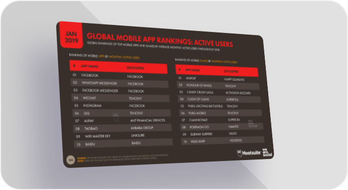 JAN GLOBAL MOBILE APP RANKINGS: ACTIVE USERS 2019 GLOBAL RANKINGS OF TOP MOBILE APPS AND GAMES BY AVERAGE MONTHLY ACTIVE USERS THROUGHOUT 2018 RANKING OF MOBILE APPS BY MONTHLY ACTIVE USERS RANKING OF MOBILE GAMES BY MONTHLY ACTIVE USERS # APP NAME DEVELOPER # APP NAME DEVELOPER 01 FACEBOOK FACEBOOK 01 ANIPOP HAPPY ELEMENTS 02 WHATSAPP MESSENGER FACEBOOK 02 HONOUR OF KINGS TENCENT 03 FACEBOOK MESSENGER FACEBOOK 03 CANDY CRUSH SAGA ACTIVISION BLIZZARD 04 WECHAT TENCENT 04 CLASH OF CLANS SUPERCELL 05 INSTAGRAM FACEBOOK 05 PUBG: EXCITING BATTLEFIELD TENCENT 06 QQ TENCENT 06 PUBG MOBILE TENCENT 07 ALIPAY ANT FINANCIAL SERVICES 07 CLASH ROYALE SUPERCELL 08 TAOBAO ALIBABA GROUP 08 POKÉMON GO NIANTIC 09 WIFI MASTER KEY LINKSURE 09 SUBWAY SURFERS KILOO 10 BAIDU BAIDU 10 HELIX JUMP VOODOO 184 SOURCE: APP ANNIE (JANUARY 2019). BASED ON COMBINED DATA FOR ANDROID AND IPHONE DEVICES. NOTE: DOES NOT INCLUDE DATA FOR DOWNLOADS FROM THIRD-PARTY ANDROID STORES.