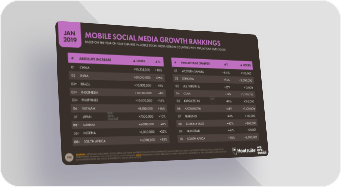 JAN MOBILE SOCIAL MEDIA GROWTH RANKINGS 2019 BASED ON THE YEAR-ON-YEAR CHANGE IN MOBILE SOCIAL MEDIA USERS IN COUNTRIES WITH POPULATIONS OVER 50,000 # ABSOLUTE INCREASE ▲ USERS ▲% # PERCENTAGE CHANGE ▲% ▲ USERS 01 CHINA +95,325,000 +10% 01 WESTERN SAHARA +442% +106,000 02 INDIA +60,000,000 +26% 02 ETHIOPIA +56% +2,000,000 03= BRAZIL +10,000,000 +8% 03 U.S. VIRGIN IS. +55% +12,000 03= INDONESIA +10,000,000 +8% 04 CUBA +53% +2,230,732 03= PHILIPPINES +10,000,000 +16% 05 KYRGYZSTAN +48% +310,000 06 VIETNAM +8,000,000 +16% 06 KAZAKHSTAN +44% +1,100,000 07 JAPAN +7,000,000 +10% 07 BURUNDI +43% +130,000 08= MEXICO +6,000,000 +8% 08 BURKINA FASO +43% +360,000 08= NIGERIA +6,000,000 +35% 09 TAJIKISTAN +41% +70,000 08= SOUTH AFRICA +6,000,000 +38% 10 SOUTH AFRICA +38% +6,000,000 SOURCES: LATEST DATA PUBLISHED BY SOCIAL MEDIA PLATFORMS VIA PRESS RELEASES, INVESTOR EARNINGS ANNOUNCEMENTS, AND IN SELF-SERVE ADVERTISING TOOLS; ARAB SOCIAL 153 MEDIA REPORT; TECHRASA; NIKI AGHAEI; ROSE.RU; KEPIOS ANALYSIS. NOTE: PENETRATION FIGURES ARE BASED ON TOTAL POPULATION, REGARDLESS OF AGE. GROWTH FIGURES BASED ON DATA REPORTED IN WE ARE SOCIAL & HOOTSUITE’S ‘DIGITAL 2018’ REPORTS.