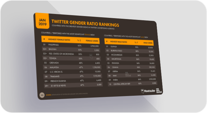 JAN TWITTER GENDER RATIO RANKINGS 2019 COUNTRIES WITH THE GREATEST GENDER SKEWS IN TWITTER’S ADVERTISING AUDIENCE COUNTRIES / TERRITORIES WITH THE MOST SIGNIFICANT FEMALE SKEW COUNTRIES / TERRITORIES WITH THE MOST SIGNIFICANT MALE SKEW # HIGHEST FEMALE RATIO % ♀ FEMALE USERS # HIGHEST MALE RATIO % ♂ MALE USERS 01 PHILIPPINES 63% 2,965,000 01 GUINEA 90% 20,800 02= BHUTAN 50% 3,200 02 BURKINA FASO 88% 12,000 02= FED. STATES OF MICRONESIA 50% 800 03 MOZAMBIQUE 86% 22,800 02= TONGA 50% 400 04 MAURITANIA 86% 19,600 05 GRENADA 48% 4,400 05 RWANDA 84% 36,800 06 MALAYSIA 47% 1,218,000 06 GHANA 84% 282,000 07 U.S. VIRGIN IS. 47% 10,000 07 LIBERIA 84% 10,410 08 THAILAND 47% 2,115,000 08 MALI 84% 14,400 09= FRENCH GUIANA 47% 6,400 09 INDIA 84% 5,925,000 09= ST. KITTS & NEVIS 47% 3,200 10 CENTRAL AFRICAN REP. 83% 2,000 122 SOURCE: EXTRAPOLATION OF TWITTER DATA (JANUARY 2019); KEPIOS ANALYSIS.