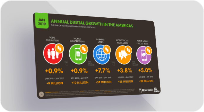 JAN ANNUAL DIGITAL GROWTH IN THE AMERICAS 2019 THE YEAR-ON-YEAR CHANGE IN KEY STATISTICAL INDICATORS TOTAL MOBILE INTERNET ACTIVE SOCIAL ACTIVE MOBILE POPULATION SUBSCRIPTIONS USERS MEDIA USERS SOCIAL USERS +0.9% +0.9% +7.7% +3.8% +5.0% JAN 2018 – JAN 2019 JAN 2018 – JAN 2019 JAN 2018 – JAN 2019 JAN 2018 – JAN 2019 JAN 2018 – JAN 2019 +9 MILLION +10 MILLION +57 MILLION +25 MILLION +29 MILLION SOURCES: POPULATION: UNITED NATIONS; U.S. CENSUS BUREAU. MOBILE: GSMA INTELLIGENCE. INTERNET: INTERNETWORLDSTATS; ITU; WORLD BANK; CIA WORLD FACTBOOK; EUROSTAT; LOCAL GOVERNMENT BODIES AND REGULATORY AUTHORITIES; MIDEASTMEDIA.ORG; REPORTS IN REPUTABLE MEDIA. SOCIAL MEDIA: PLATFORMS’ SELF-SERVE ADVERTISING TOOLS; PRESS 15 RELEASES AND INVESTOR EARNINGS ANNOUNCEMENTS; ARAB SOCIAL MEDIA REPORT; TECHRASA; NIKI AGHAEI; ROSE.RU. (ALL LATEST AVAILABLE DATA IN JANUARY 2019).