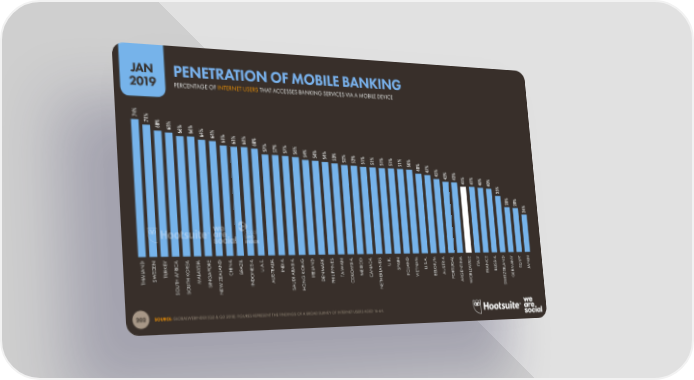 JAN PENETRATION OF MOBILE BANKING 2019 PERCENTAGE OF INTERNET USERS THAT ACCESSES BANKING SERVICES VIA A MOBILE DEVICE 74% 71% 68%68% 66%66% 64%64% 61%61%61%60% 57%57%57%56%54% 54%54% 53%52%52% 51%51%51%51%51%50% 48%47% 45%43%43% 41% 41%40%40% 35% 28%28% 24% global web index Y A A A E A L A . A A A K S A A S . . A L A E Y E A Y T D N I R D I I E I I I G D N I O K N D M A M I L I D P N E E C E S N Z S . L R E D D . I N . A N D C N Y N K I R N A D B N N A B C U A A S U R I I A S N A D Y O I A E . A A N I A N . I T G T N S A P A R R P A H R R N A O A I M X P A N S T W I A G L E F O A L U I R L M W L U G U A U L A I U A B N T I E N A S T L T N M E J A K L A C K E PP O L U D R R R A W T S A R N I A A O E E R E L E R A G E O L L M R I F H S H H Z D U I G I E I T C E P V B A O G R Z E T T T M N A D D H O P R O T G I N U N P C H I U U S W I O T A O O E A E W W S S N S H N S 202 SOURCE: GLOBALWEBINDEX (Q2 & Q3 2018). FIGURES REPRESENT THE FINDINGS OF A BROAD SURVEY OF INTERNET USERS AGED 16-64.
