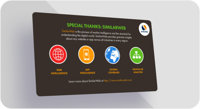 SPECIAL THANKS: SIMILARWEB SimilarWeb is the pioneer of market intelligence and the standard for understanding the digital world. SimilarWeb provides granular insights about any website or app across all industries in every region. WEB APP GLOBAL GRANULAR INTELLIGENCE INTELLIGENCE COVERAGE ANALYSIS Learn more about SimilarWeb at http://www.similarweb.com