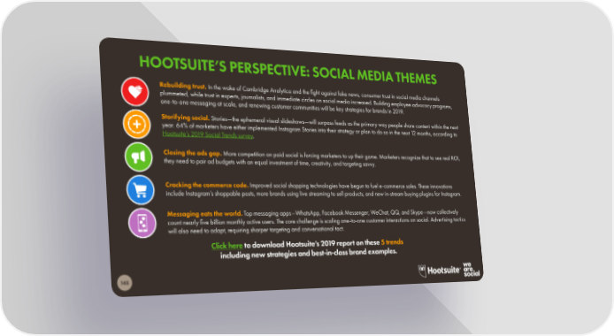 HOOTSUITE’S PERSPECTIVE: SOCIAL MEDIA THEMES Rebuilding trust. In the wake of Cambridge Analytica and the fight against fake news, consumer trust in social media channels plummeted, while trust in experts, journalists, and immediate circles on social media increased. Building employee advocacy programs, one-to-one messaging at scale, and renewing customer communities will be key strategies for brands in 2019. Storifying social. Stories—the ephemeral visual slideshows—will surpass feeds as the primary way people share content within the next year. 64% of marketers have either implemented Instagram Stories into their strategy or plan to do so in the next 12 months, according to Hootsuite’s 2019 Social Trends survey. Closing the ads gap. More competition on paid social is forcing marketers to up their game. Marketers recognize that to see real ROI, they need to pair ad budgets with an equal investment of time, creativity, and targeting savvy. Cracking the commerce code. Improved social shopping technologies have begun to fuel e-commerce sales. These innovations include Instagram’s shoppable posts, more brands using live streaming to sell products, and new in-stream buying plugins for Instagram. Messaging eats the world. Top messaging apps—WhatsApp, Facebook Messenger, WeChat, QQ, and Skype—now collectively count nearly five billion monthly active users. The core challenge is scaling one-to-one customer interactions on social. Advertising tactics will also need to adapt, requiring sharper targeting and conversational tact. Click here to download Hootsuite’s 2019 report on these 5 trends including new strategies and best-in-class brand examples. 145
