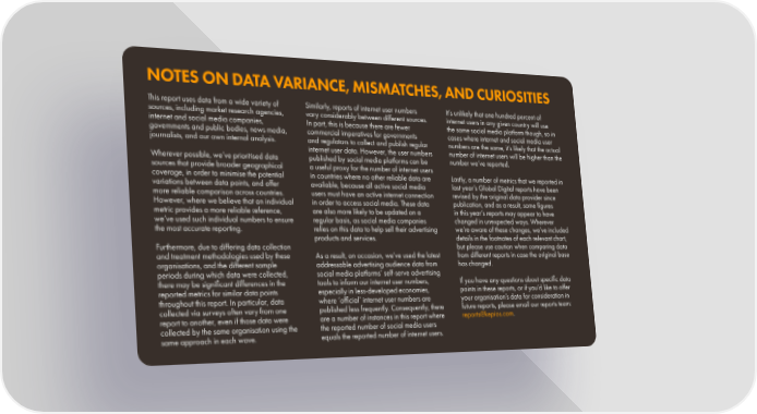 NOTES ON DATA VARIANCE, MISMATCHES, AND CURIOSITIES This report uses data from a wide variety of Similarly, reports of internet user numbers It’s unlikely that one hundred percent of sources, including market research agencies, vary considerably between different sources. internet users in any given country will use internet and social media companies, In part, this is because there are fewer the same social media platform though, so in governments and public bodies, news media, commercial imperatives for governments cases where internet and social media user journalists, and our own internal analysis. and regulators to collect and publish regular numbers are the same, it’s likely that the actual internet user data. However, the user numbers number of internet users will be higher than the Wherever possible, we’ve prioritised data published by social media platforms can be number we’ve reported. sources that provide broader geographical a useful proxy for the number of internet users coverage, in order to minimise the potential in countries where no other reliable data are Lastly, a number of metrics that we reported in variations between data points, and offer available, because all active social media last year’s Global Digital reports have been more reliable comparison across countries. users must have an active internet connection revised by the original data provider since However, where we believe that an individual in order to access social media. These data publication, and as a result, some figures metric provides a more reliable reference, are also more likely to be updated on a in this year’s reports may appear to have we’ve used such individual numbers to ensure regular basis, as social media companies changed in unexpected ways. Wherever the most accurate reporting. relies on this data to help sell their advertising we’re aware of these changes, we’ve included products and services. details in the footnotes of each relevant chart, Furthermore, due to differing data collection but please use caution when comparing data and treatment methodologies used by these As a result, on occasion, we’ve used the latest from different reports in case the original base organisations, and the different sample addressable advertising audience data from has changed. periods during which data were collected, social media platforms’ self-serve advertising there may be significant differences in the tools to inform our internet user numbers, If you have any questions about specific data reported metrics for similar data points especially in less-developed economies, points in these reports, or if you’d like to offer throughout this report. In particular, data where ‘official’ internet user numbers are your organisation’s data for consideration in collected via surveys often vary from one published less frequently. Consequently, there future reports, please email our reports team: report to another, even if those data were are a number of instances in this report where reports@kepios.com. collected by the same organisation using the the reported number of social media users same approach in each wave. equals the reported number of internet users.