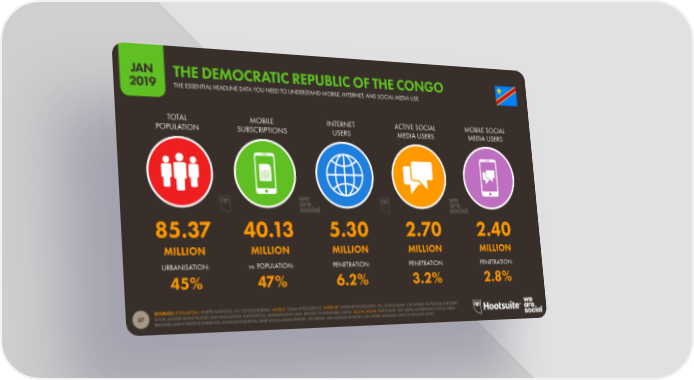 JAN THE DEMOCRATIC REPUBLIC OF THE CONGO 2019 THE ESSENTIAL HEADLINE DATA YOU NEED TO UNDERSTAND MOBILE, INTERNET, AND SOCIAL MEDIA USE TOTAL MOBILE INTERNET ACTIVE SOCIAL MOBILE SOCIAL POPULATION SUBSCRIPTIONS USERS MEDIA USERS MEDIA USERS 85.37 40.13 5.30 2.70 2.40 MILLION MILLION MILLION MILLION MILLION URBANISATION: vs. POPULATION: PENETRATION: PENETRATION: PENETRATION: 45% 47% 6.2% 3.2% 2.8% SOURCES: POPULATION: UNITED NATIONS; U.S. CENSUS BUREAU. MOBILE: GSMA INTELLIGENCE. INTERNET: INTERNETWORLDSTATS; ITU; WORLD BANK; CIA WORLD FACTBOOK; EUROSTAT; LOCAL GOVERNMENT BODIES AND REGULATORY AUTHORITIES; MIDEASTMEDIA.ORG; REPORTS IN REPUTABLE MEDIA. SOCIAL MEDIA: PLATFORMS’ SELF-SERVE ADVERTISING TOOLS; PRESS 57 RELEASES AND INVESTOR EARNINGS ANNOUNCEMENTS; ARAB SOCIAL MEDIA REPORT; TECHRASA; NIKI AGHAEI; ROSE.RU. (ALL LATEST AVAILABLE DATA IN JANUARY 2019).
