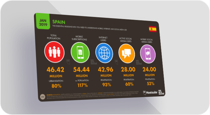 JAN SPAIN 2019 THE ESSENTIAL HEADLINE DATA YOU NEED TO UNDERSTAND MOBILE, INTERNET, AND SOCIAL MEDIA USE TOTAL MOBILE INTERNET ACTIVE SOCIAL MOBILE SOCIAL POPULATION SUBSCRIPTIONS USERS MEDIA USERS MEDIA USERS 46.42 54.44 42.96 28.00 24.00 MILLION MILLION MILLION MILLION MILLION URBANISATION: vs. POPULATION: PENETRATION: PENETRATION: PENETRATION: 80% 117% 93% 60% 52% SOURCES: POPULATION: UNITED NATIONS; U.S. CENSUS BUREAU. MOBILE: GSMA INTELLIGENCE. INTERNET: INTERNETWORLDSTATS; ITU; WORLD BANK; CIA WORLD FACTBOOK; EUROSTAT; LOCAL GOVERNMENT BODIES AND REGULATORY AUTHORITIES; MIDEASTMEDIA.ORG; REPORTS IN REPUTABLE MEDIA. SOCIAL MEDIA: PLATFORMS’ SELF-SERVE ADVERTISING TOOLS; PRESS 213 RELEASES AND INVESTOR EARNINGS ANNOUNCEMENTS; ARAB SOCIAL MEDIA REPORT; TECHRASA; NIKI AGHAEI; ROSE.RU. (ALL LATEST AVAILABLE DATA IN JANUARY 2019).