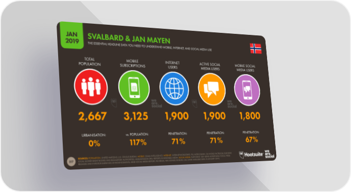 JAN SVALBARD & JAN MAYEN 2019 THE ESSENTIAL HEADLINE DATA YOU NEED TO UNDERSTAND MOBILE, INTERNET, AND SOCIAL MEDIA USE TOTAL MOBILE INTERNET ACTIVE SOCIAL MOBILE SOCIAL POPULATION SUBSCRIPTIONS USERS MEDIA USERS MEDIA USERS 2,667 3,125 1,900 1,900 1,800 URBANISATION: vs. POPULATION: PENETRATION: PENETRATION: PENETRATION: 0% 117% 71% 71% 67% SOURCES: POPULATION: UNITED NATIONS; U.S. CENSUS BUREAU. MOBILE: GSMA INTELLIGENCE. INTERNET: INTERNETWORLDSTATS; ITU; WORLD BANK; CIA WORLD FACTBOOK; EUROSTAT; 217 LOCAL GOVERNMENT BODIES AND REGULATORY AUTHORITIES; MIDEASTMEDIA.ORG; REPORTS IN REPUTABLE MEDIA. SOCIAL MEDIA: PLATFORMS’ SELF-SERVE ADVERTISING TOOLS; PRESS RELEASES AND INVESTOR EARNINGS ANNOUNCEMENTS; ARAB SOCIAL MEDIA REPORT; TECHRASA; NIKI AGHAEI; ROSE.RU. (ALL LATEST AVAILABLE DATA IN JANUARY 2019).
