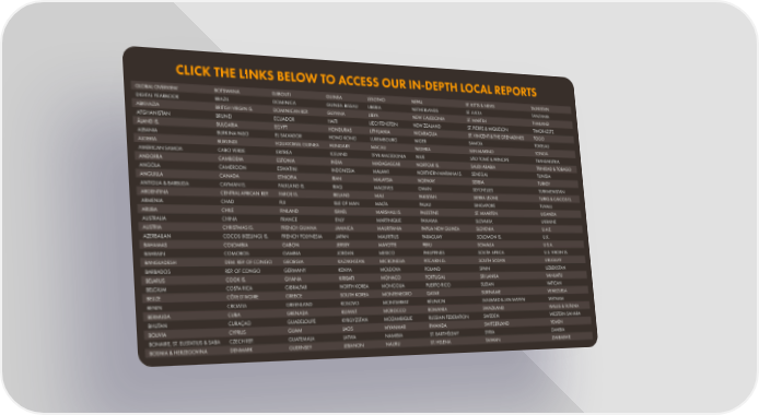 CLICK THE LINKS BELOW TO ACCESS OUR IN-DEPTH LOCAL REPORTS GLOBAL OVERVIEW BOTSWANA DJIBOUTI GUINEA LESOTHO NEPAL ST. KITTS & NEVIS TAJIKISTAN DIGITAL YEARBOOK BRAZIL DOMINICA GUINEA-BISSAU LIBERIA NETHERLANDS ST. LUCIA TANZANIA ABKHAZIA BRITISH VIRGIN IS. DOMINICAN REP. GUYANA LIBYA NEW CALEDONIA ST. MARTIN THAILAND AFGHANISTAN BRUNEI ECUADOR HAITI LIECHTENSTEIN NEW ZEALAND ST. PIERRE & MIQUELON TIMOR-LESTE ÅLAND IS. BULGARIA EGYPT HONDURAS LITHUANIA NICARAGUA ST. VINCENT & THE GRENADINES TOGO ALBANIA BURKINA FASO EL SALVADOR HONG KONG LUXEMBOURG NIGER SAMOA TOKELAU ALGERIA BURUNDI EQUATORIAL GUINEA HUNGARY MACAU NIGERIA SAN MARINO TONGA AMERICAN SAMOA CABO VERDE ERITREA ICELAND TFYR MACEDONIA NIUE SÃO TOMÉ & PRÍNCIPE TRANSNISTRIA ANDORRA CAMBODIA ESTONIA INDIA MADAGASCAR NORFOLK IS. SAUDI ARABIA TRINIDAD & TOBAGO ANGOLA CAMEROON ESWATINI INDONESIA MALAWI NORTHERN MARIANA IS. SENEGAL TUNISIA ANGUILLA CANADA ETHIOPIA IRAN MALAYSIA NORWAY SERBIA TURKEY ANTIGUA & BARBUDA CAYMAN IS. FALKLAND IS. IRAQ MALDIVES OMAN SEYCHELLES TURKMENISTAN ARGENTINA CENTRAL AFRICAN REP. FAROE IS. IRELAND MALI PAKISTAN SIERRA LEONE TURKS & CAICOS IS. ARMENIA CHAD FIJI ISLE OF MAN MALTA PALAU SINGAPORE TUVALU ARUBA CHILE FINLAND ISRAEL MARSHALL IS. PALESTINE ST. MAARTEN UGANDA AUSTRALIA CHINA FRANCE ITALY MARTINIQUE PANAMA SLOVAKIA UKRAINE AUSTRIA CHRISTMAS IS. FRENCH GUIANA JAMAICA MAURITANIA PAPUA NEW GUINEA SLOVENIA U.A.E. AZERBAIJAN COCOS (KEELING) IS. FRENCH POLYNESIA JAPAN MAURITIUS PARAGUAY SOLOMON IS. U.K. BAHAMAS COLOMBIA GABON JERSEY MAYOTTE PERU SOMALIA U.S.A. BAHRAIN COMOROS GAMBIA JORDAN MEXICO PHILIPPINES SOUTH AFRICA U.S. VIRGIN IS. BANGLADESH DEM. REP. OF CONGO GEORGIA KAZAKHSTAN MICRONESIA PITCAIRN IS. SOUTH SUDAN URUGUAY BARBADOS REP. OF CONGO GERMANY KENYA MOLDOVA POLAND SPAIN UZBEKISTAN BELARUS COOK IS. GHANA KIRIBATI MONACO PORTUGAL SRI LANKA VANUATU BELGIUM COSTA RICA GIBRALTAR NORTH KOREA MONGOLIA PUERTO RICO SUDAN VATICAN BELIZE CÔTE D’IVOIRE GREECE SOUTH KOREA MONTENEGRO QATAR SURINAME VENEZUELA BENIN CROATIA GREENLAND KOSOVO MONTSERRAT RÉUNION SVALBARD & JAN MAYEN VIETNAM BERMUDA CUBA GRENADA KUWAIT MOROCCO ROMANIA SWAZILAND WALLIS & FUTUNA BHUTAN CURAÇAO GUADELOUPE KYRGYZSTAN MOZAMBIQUE RUSSIAN FEDERATION SWEDEN WESTERN SAHARA BOLIVIA CYPRUS GUAM LAOS MYANMAR RWANDA SWITZERLAND YEMEN BONAIRE, ST. EUSTATIUS & SABA CZECH REP. GUATEMALA LATVIA NAMIBIA ST. BARTHÉLEMY SYRIA ZAMBIA BOSNIA & HERZEGOVINA DENMARK GUERNSEY LEBANON NAURU ST. HELENA TAIWAN ZIMBABWE