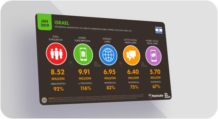 JAN ISRAEL 2019 THE ESSENTIAL HEADLINE DATA YOU NEED TO UNDERSTAND MOBILE, INTERNET, AND SOCIAL MEDIA USE TOTAL MOBILE INTERNET ACTIVE SOCIAL MOBILE SOCIAL POPULATION SUBSCRIPTIONS USERS MEDIA USERS MEDIA USERS 8.52 9.91 6.95 6.40 5.70 MILLION MILLION MILLION MILLION MILLION URBANISATION: vs. POPULATION: PENETRATION: PENETRATION: PENETRATION: 92% 116% 82% 75% 67% SOURCES: POPULATION: UNITED NATIONS; U.S. CENSUS BUREAU. MOBILE: GSMA INTELLIGENCE. INTERNET: INTERNETWORLDSTATS; ITU; WORLD BANK; CIA WORLD FACTBOOK; EUROSTAT; 113 LOCAL GOVERNMENT BODIES AND REGULATORY AUTHORITIES; MIDEASTMEDIA.ORG; REPORTS IN REPUTABLE MEDIA. SOCIAL MEDIA: PLATFORMS’ SELF-SERVE ADVERTISING TOOLS; PRESS RELEASES AND INVESTOR EARNINGS ANNOUNCEMENTS; ARAB SOCIAL MEDIA REPORT; TECHRASA; NIKI AGHAEI; ROSE.RU. (ALL LATEST AVAILABLE DATA IN JANUARY 2019).
