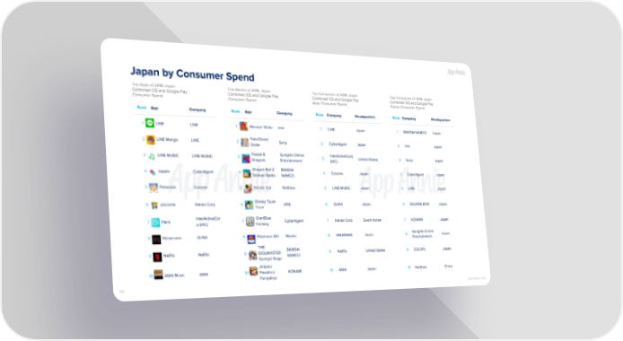 Japan by Consumer Spend Top Apps of 2018: Japan Top Games of 2018: Japan Top Companies of 2018: Japan Top Companies of 2018: Japan Combined iOS and Google Play Combined iOS and Google Play Combined iOS and Google Play Combined iOS and Google Play Consumer Spend Consumer Spend Apps Consumer Spend Games Consumer Spend Rank App Company Rank App Company Rank Company Headquarters Rank Company Headquarters 1 LINE LINE 1 Monster Strike mixi 1 LINE Japan 1 BANDAI NAMCO Japan Fate/Grand 2 LINE Manga LINE 2 Sony 2 CyberAgent Japan 2 mixi Japan Order Puzzle & GungHo Online InterActiveCorp 3 LINE MUSIC LINE MUSIC 3 3 United States 3 Sony Japan Dragons Entertainment (IAC) Dragon Ball Z BANDAI 4 tapple CyberAgent 4 4 Cocone Japan 4 CyberAgent Japan Dokkan Battle NAMCO 5 Pokecolo Cocone 5 Knives Out NetEase 5 LINE MUSIC Japan 5 LINE Japan Disney Tsum 6 piccoma Kakao Corp 6 LINE 6 DeNA Japan 6 SQUARE ENIX Japan Tsum InterActiveCor GranBlue 7 Pairs 7 CyberAgent 7 Kakao Corp South Korea 7 KONAMI Japan p (IAC) Fantasy GungHo Online 8 Showroom DeNA 8 Pokémon GO Niantic 8 SHUEISHA Japan 8 Japan Entertainment THE BANDAI 9 Netflix Netflix 9 IDOLM@STER 9 Netflix United States 9 COLOPL Japan NAMCO Starlight Stage Jikkyou 10 AWA Music AWA 10 Pawafuru KONAMI 10 AWA Japan 10 NetEase China Puroyakyu 109 COPYRIGHT 2019