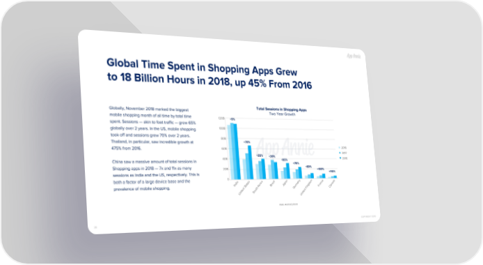 Global Time Spent in Shopping Apps Grew to 18 Billion Hours in 2018, up 45% From 2016 Total Sessions in Shopping Apps Globally, November 2018 marked the biggest Two Year Growth mobile shopping month of all time by total time 120B +5% spent. Sessions — akin to foot traffic — grew 65% 100B globally over 2 years. In the US, mobile shopping took off and sessions grew 70% over 2 years. 80B +70% Thailand, in particular, saw incredible growth at 2016 60B 475% from 2016. 2017 +35% +20% 2018 40B +95% China saw a massive amount of total sessions in +75% +80% Shopping apps in 2018 — 7x and 11x as many 20B +100% +110% sessions as India and the US, respectively. This is 0 both a factor of a large device base and the India Japan Brazil prevalence of mobile shopping. France Canada Germany South Korea United States United Kingdom Note: Android phone 26 COPYRIGHT 2019